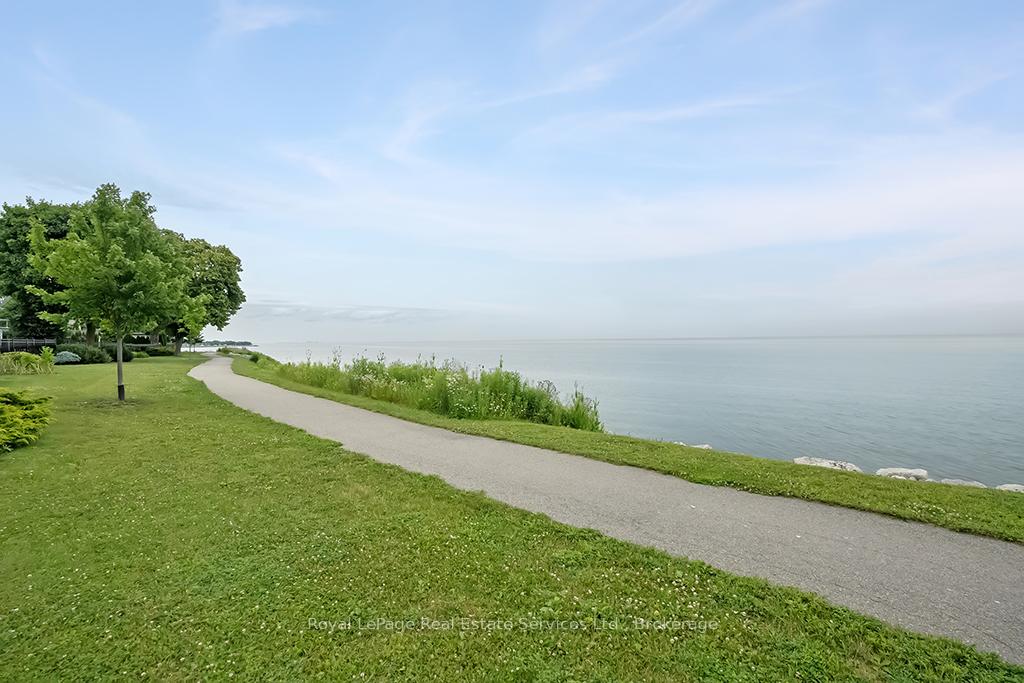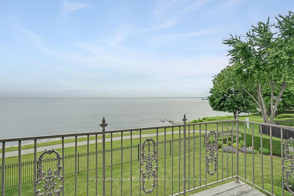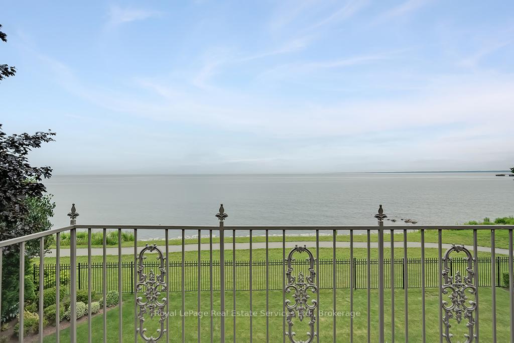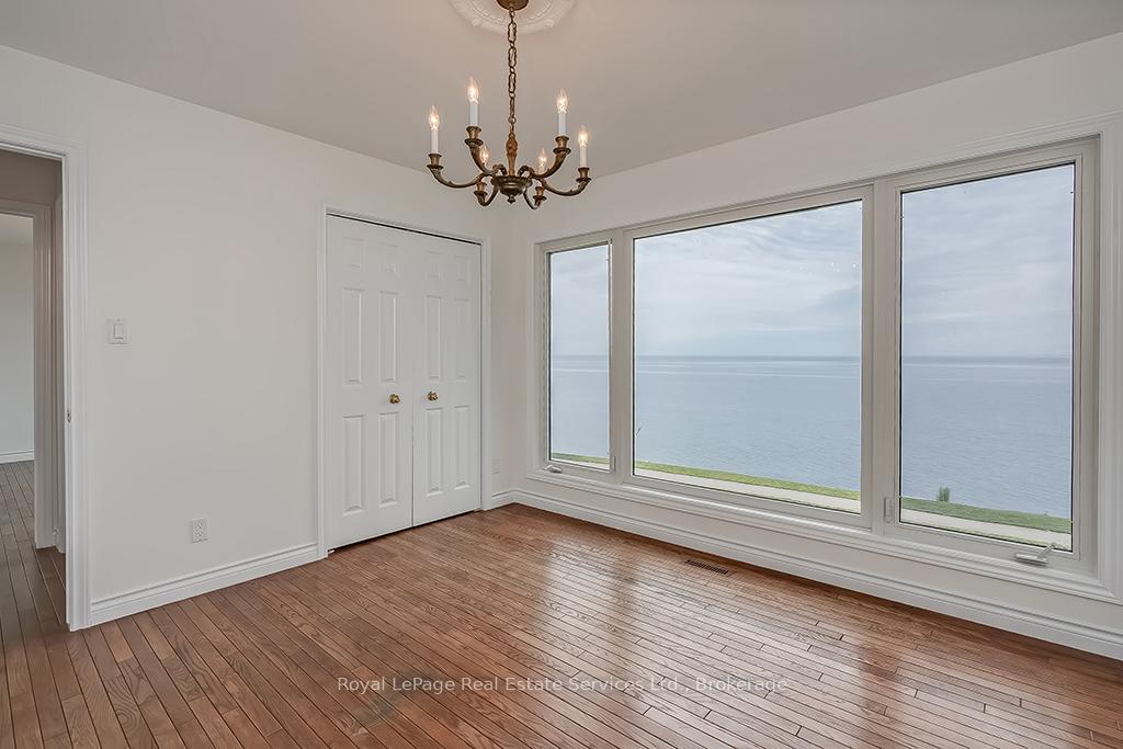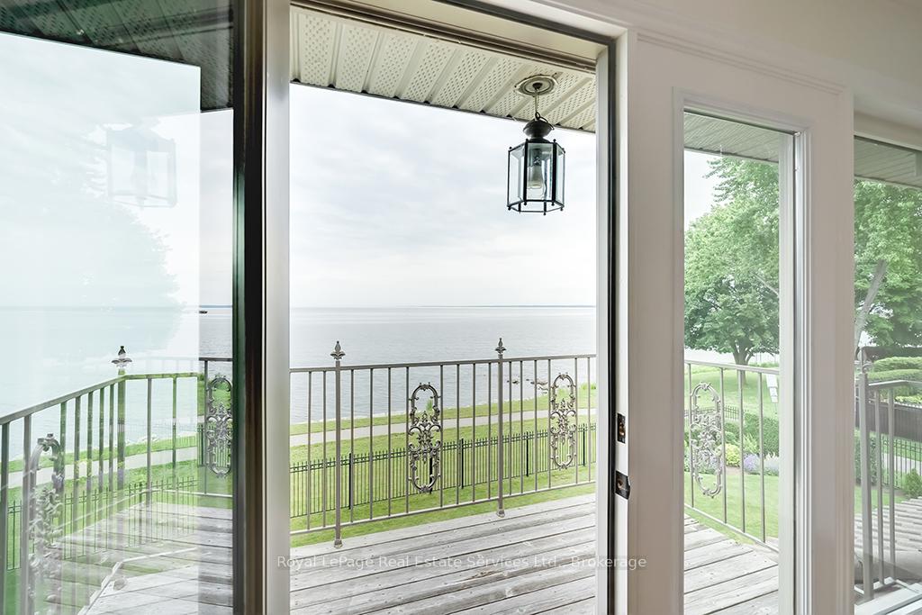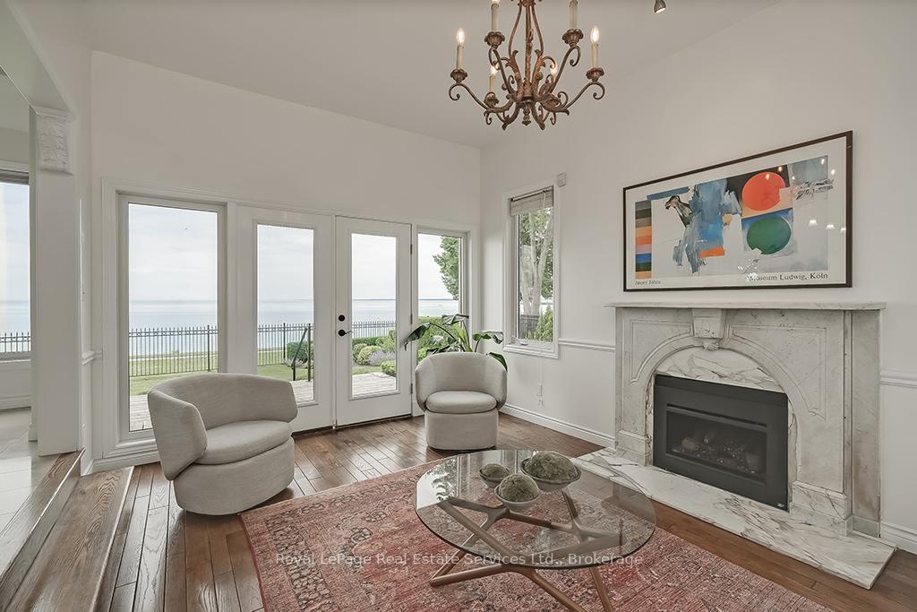 Spectacular lakefront property with 93' frontage on Lake Ontario. Located on a quiet, mature cul-de-sac, this custom built, family home offers 4+1 Bedrooms, 3.5 Baths with over 2800SF above-grade + 1400 SF Finished Lower Level. Architecturally designed with wall-to-wall windows overlooking the lake, solid brick construction with clay tile roofing, this home was built to last. 9 and 10 ceilings on the main floor. Oak hardwood floors throughout both levels. Grand entrance foyer with oak staircase. Beautiful Living Room with fabulous antique marble fireplace surround with gas insert open to Dining Room with wall to wall patio doors to the terrace with incredible lake views. Fabulous Kitchen/Breakfast Room is a blank canvas with the perfect space to install the waterfront Kitchen of your dreams. Walk-outs to both decks and open to the the Family Room with stunning marble fireplace with gas insert. The main floor features a mudroom with side entry and inside entry from full-sized two-car garage. The Primary suite features oversized windows and a walk-out to second floor balcony with outstanding lake views, luxury ensuite bathroom and walk-in closet. Two more Bedrooms overlook the lake with oversized windows. The front Bedroom opens to a bonus room above the garage which could be handy as a Den or quiet retreat. The Lower Level has excellent ceilings height, good windows and features 1Bedroom, 3-Piece Bathroom, Recreation Room, Den, Laundry Room, storage and more. Beautifully landscaped and maintained property fully fenced with wrought iron gate access to the lake. Cobblestone driveway accommodates 4 cars. Outstanding value on Lake Ontario. A must see!