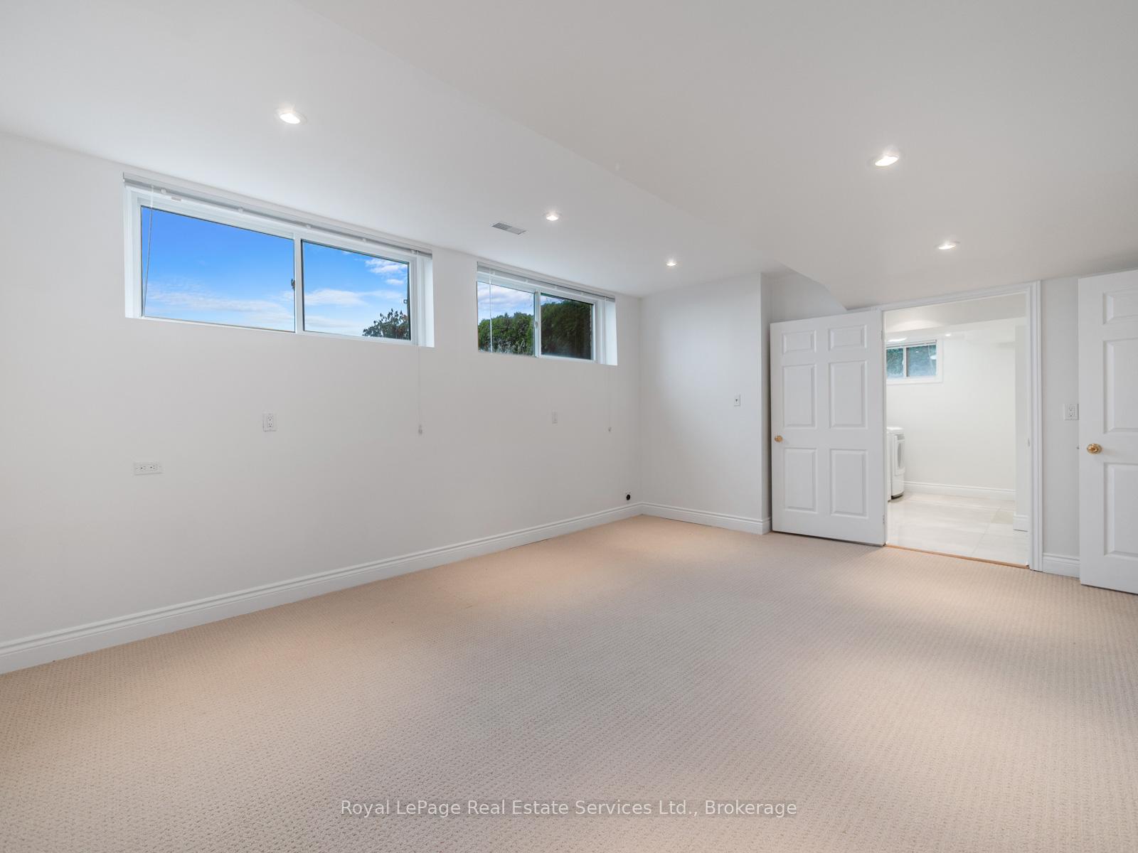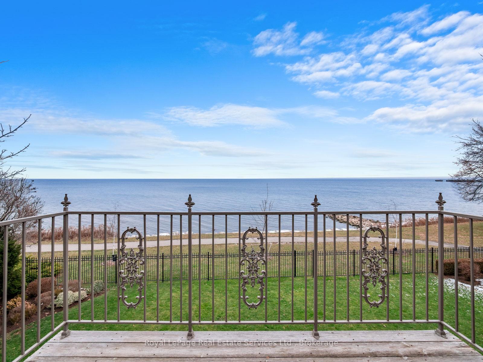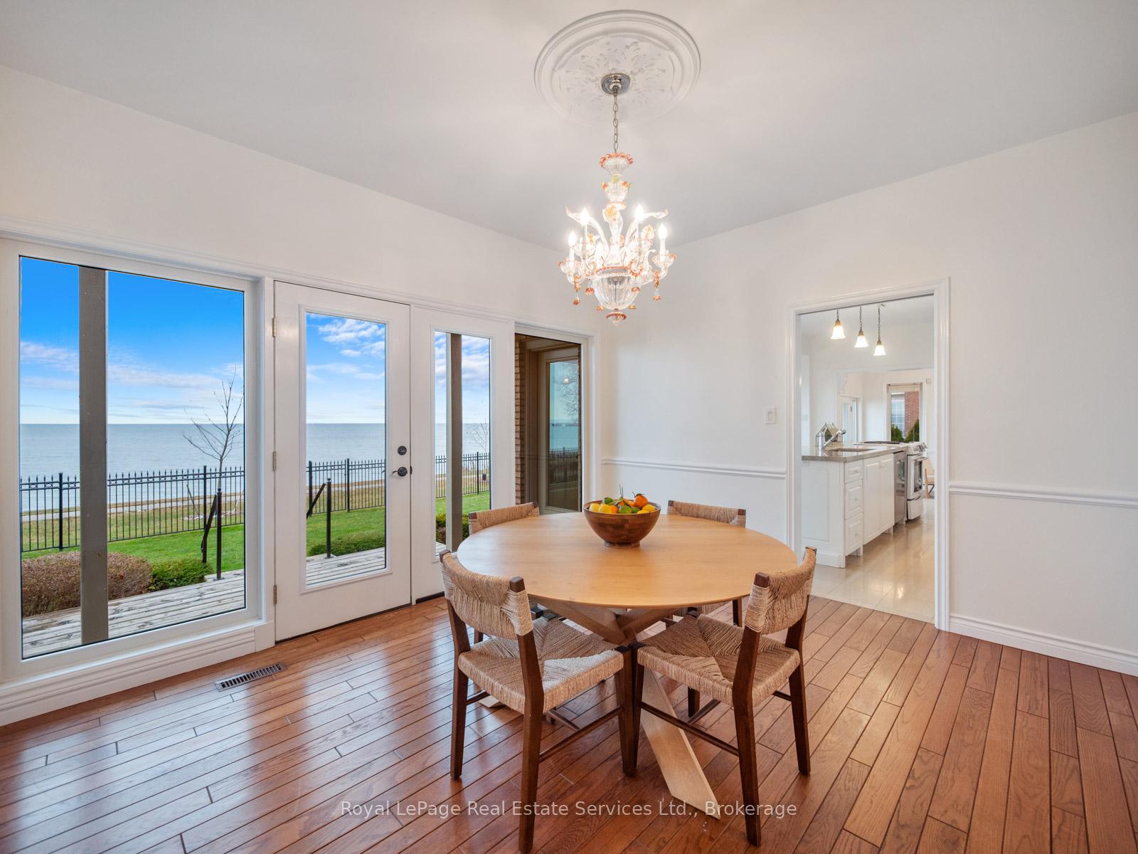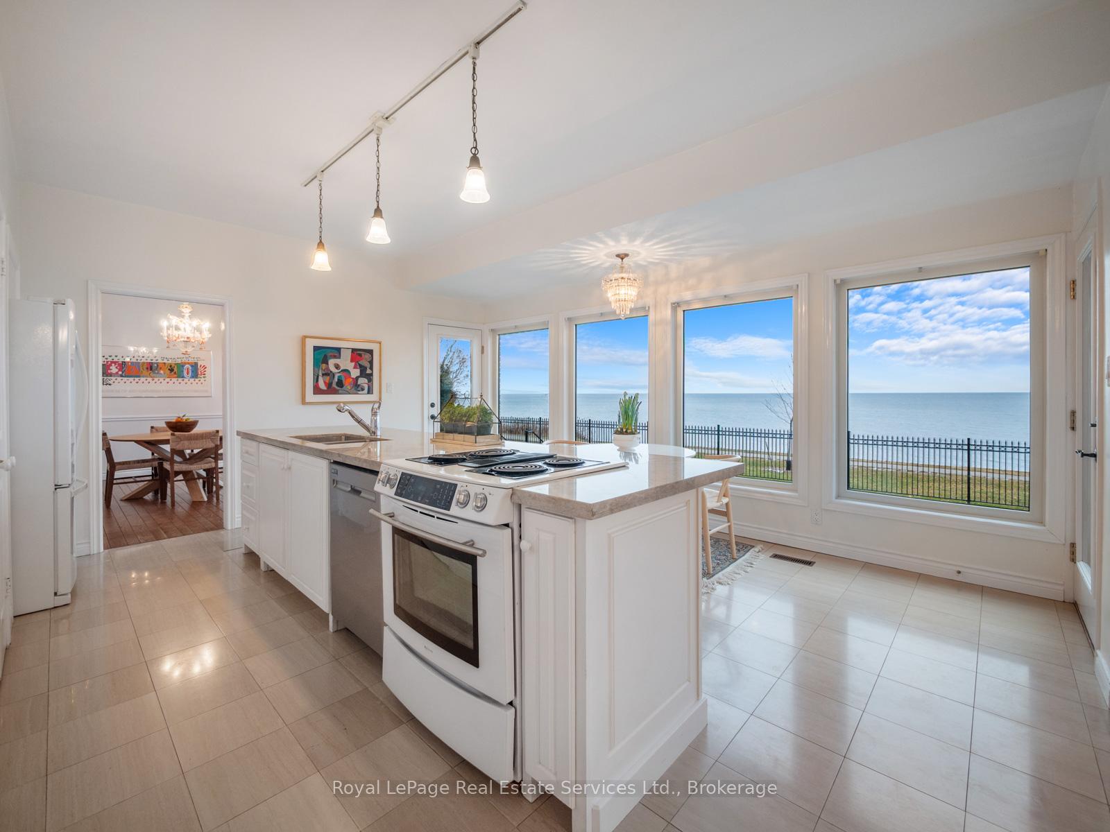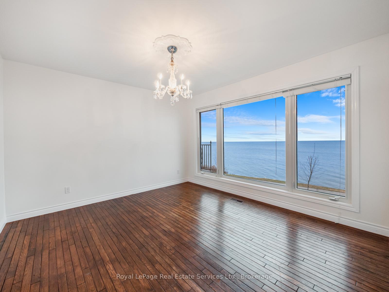Spectacular lakefront property with 93' frontage on Lake Ontario. Located on a quiet, mature cul-de-sac, this custom built, family home offers 4+1 Bedrooms, 3.5 Baths with over 2800SF above-grade + 1400 SF Finished Lower Level. Architecturally designed with wall-to-wall windows overlooking the lake, solid brick construction with clay tile roofing, this home was built to last. 9' and 10' ceilings on the main floor. Oak hardwood floors throughout both levels. Grand entrance foyer with oak staircase. Beautiful Living Room with fabulous marble fireplace surround with gas insert open to Dining Room with wall to wall patio doors to the terrace with incredible lake views. Fabulous Kitchen/Breakfast Room is a blank canvas with the perfect space to install the waterfront Kitchen of your dreams. Walk-outs to both decks and open to the the Family Room with stunning marble fireplace with gas insert. The main floor features a mudroom with side entry and inside entry from full-sized two-car garage. The Primary suite features oversized windows and a walk-out to second floor balcony with outstanding lake views, luxury ensuite bathroom and walk-in closet. Two more Bedrooms overlook the lake with oversized windows. The front Bedroom opens to a bonus room above the garage which could be handy as a Den or quiet retreat. The Lower Level has excellent ceilings height, good windows and features one Bedroom, a 3-Piece Bathroom, Recreation Room, Den, Laundry Room, storage and more. Beautifully landscaped and maintained property fully fenced with wrought iron gate access to the lake. Cobblestone driveway accommodates 4 cars. Outstanding value on Lake Ontario. A must see!