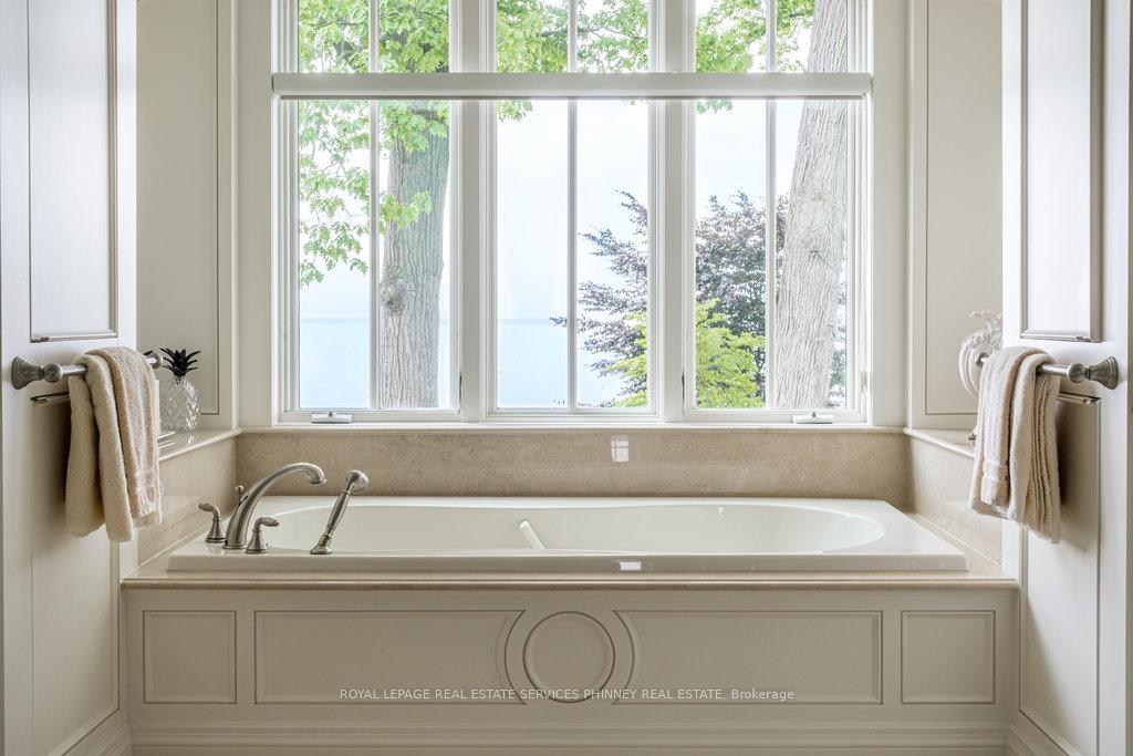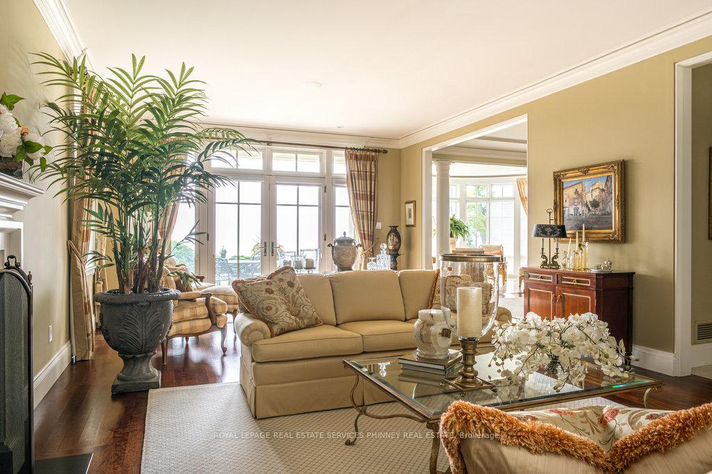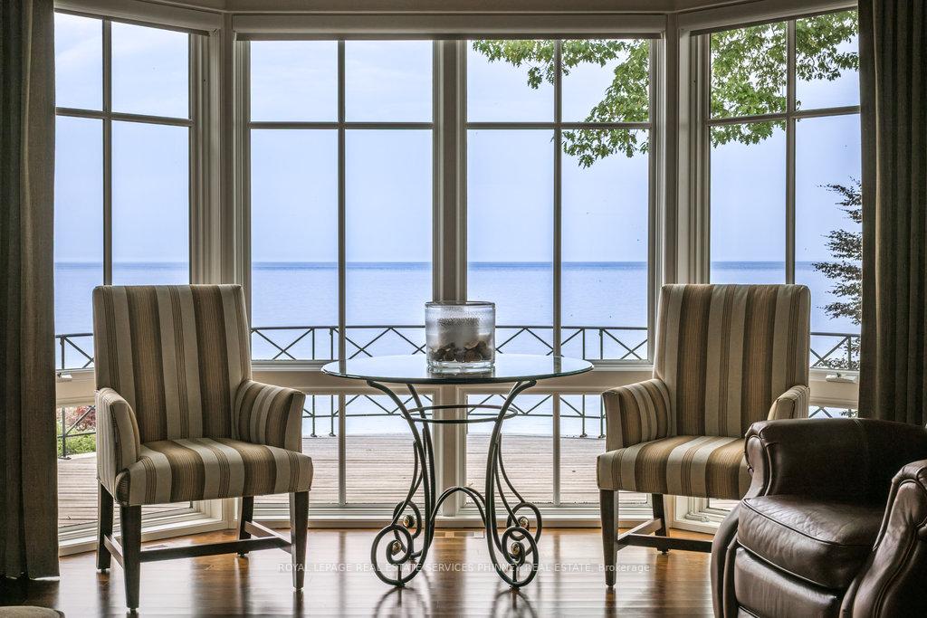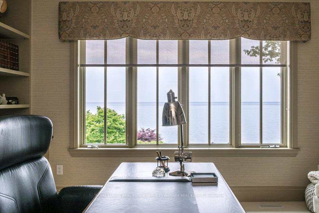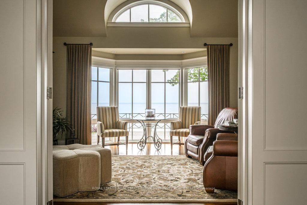 Gracefully set along the shores of Lake Ontario, this exceptional custom estate-designed by Gren Weis-occupies a prestigious waterfront property with coveted riparian rights in one of South-East Oakville's most exclusive enclaves. Framed by breathtaking lake views and a rare sense of privacy, the residence offers an extraordinary lifestyle where timeless architecture meets modern luxury. Classical proportions, refined interiors, and impeccable craftsmanship define every space-from intricate millwork and detailed ceilings to radiant heated floors and upgraded lighting. Expansive principal rooms are thoughtfully oriented to capture sweeping water vistas, creating a spectacular setting for elegant entertaining and relaxed family living. At the heart of the main level, a magnificent living room with double French doors welcomes the fresh lake breeze, while a luminous solarium overlooks the gardens. The level is completed by a formal dining room, a gourmet kitchen with professional-grade appliances and dedicated prep kitchen, and a sun-filled family room distinguished by striking waffle ceilings. The upper level reveals a tranquil primary suite with spa-inspired ensuite and dressing room, accompanied by three additional bedrooms, two beautifully appointed bathrooms, and an elegant library with sweeping views across the water. The lower level continues the home's exceptional scale with full-size windows, radiant heated floors, a spacious recreation room with wet bar, fitness studio with full bath, private guest suite with ensuite, and abundant storage. Outdoors, manicured gardens blend seamlessly with the natural beauty of the lakefront. Multiple walkouts connect the home to the grounds and shoreline-making morning paddleboarding or an evening canoe launch part of everyday life. Steps from Gairloch Gardens & minutes to DT Oakville's boutiques, dining, culture, and top schools, this remarkable property offers a rare opportunity to experience waterfront living at its finest