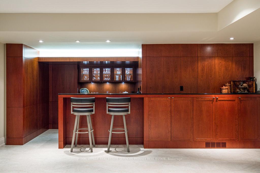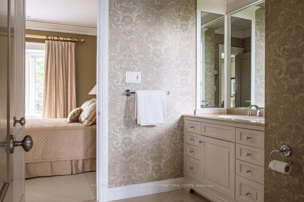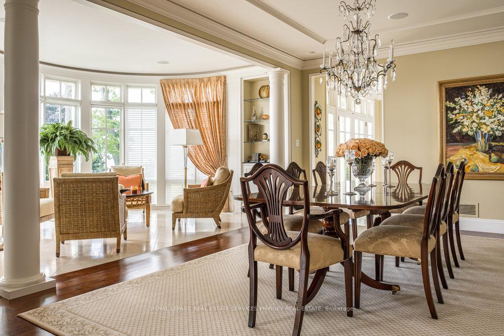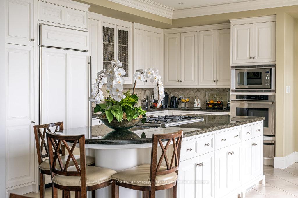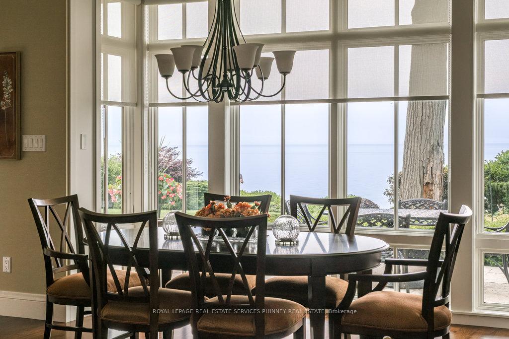 Gracefully set along the shores of Lake Ontario, this exceptional custom estate-designed by Gren Weis-occupies a prestigious waterfront property with coveted riparian rights in one of South-East Oakville's most exclusive enclaves. Framed by breathtaking lake views and a rare sense of privacy, the residence offers an extraordinary lifestyle where timeless architecture meets modern luxury. Classical proportions, refined interiors, and impeccable craftsmanship define every space-from intricate millwork and detailed ceilings to radiant heated floors and upgraded lighting. Expansive principal rooms are thoughtfully oriented to capture sweeping water vistas, creating a spectacular setting for elegant entertaining and relaxed family living. At the heart of the main level, a magnificent living room with double French doors welcomes the fresh lake breeze, while a luminous solarium overlooks the gardens. The level is completed by a formal dining room, a gourmet kitchen with professional-grade appliances and dedicated prep kitchen, and a sun-filled family room distinguished by striking waffle ceilings. The upper level reveals a tranquil primary suite with spa-inspired ensuite and dressing room, accompanied by three additional bedrooms, two beautifully appointed bathrooms, and an elegant library with sweeping views across the water. The lower level continues the home's exceptional scale with full-size windows, radiant heated floors, a spacious recreation room with wet bar, fitness studio with full bath, private guest suite with ensuite, and abundant storage. Outdoors, manicured gardens blend seamlessly with the natural beauty of the lakefront. Multiple walkouts connect the home to the grounds and shoreline-making morning paddleboarding or an evening canoe launch part of everyday life. Steps from Gairloch Gardens & minutes to DT Oakville's boutiques, dining, culture, and top schools, this remarkable property offers a rare opportunity to experience waterfront living at its finest